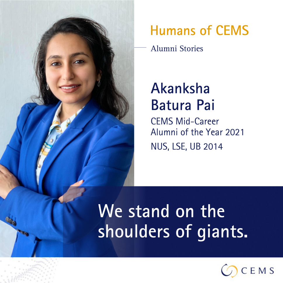 Today, in our Humans of CEMS series, we meet CEMS Alumni of the Year Akanksha Batura Pai - Head of Strategy & Growth at Sinoda Shipping Agency, Council Member of the Singapore Shipping Association, IMO Goodwill Maritime Ambassador, and much more. Akanksha graduated from the National University of Singapore in 2014, having spent two exchange semesters at the London School of Economics & Political Science and Bocconi University. Since then, she has been working in shipping and logistics, while also actively participating in international alliances and initiatives to support cooperation and societal development, specifically focusing on vulnerable groups.